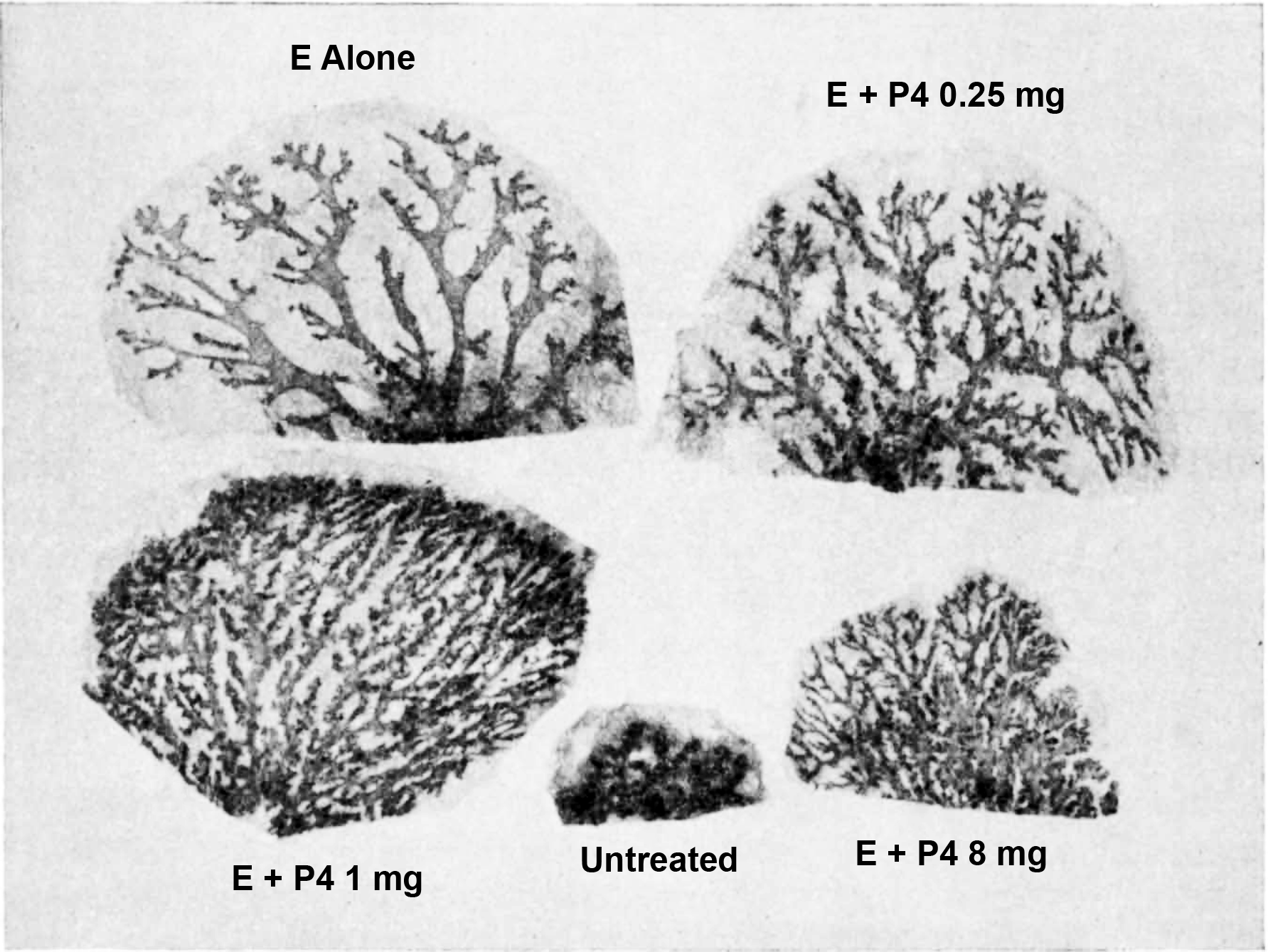 Group 1, 120 I.U. of estrone (theelin); Group 2, 1 I.U. of progesterone; Group 3, 120 I.U. of E and 0.25 I.U. of P; Group 4, 120 I. U. of E and 1 I.U. of P; Group 5, 1201 I.U. of E and 4 I.U. of P; Group 6, 120 I.U. of E and 8 I.U. of P. The 2 hormones were given separately, subcutaneously, in peanut oil. On 3/28/39, 5 days after the last injection, a biopsy specimen of the second left (thoracic) mammary gland was taken from each animal, fixed in formol, stained in toto with alum-carmine and cleared in methyl salicylate.